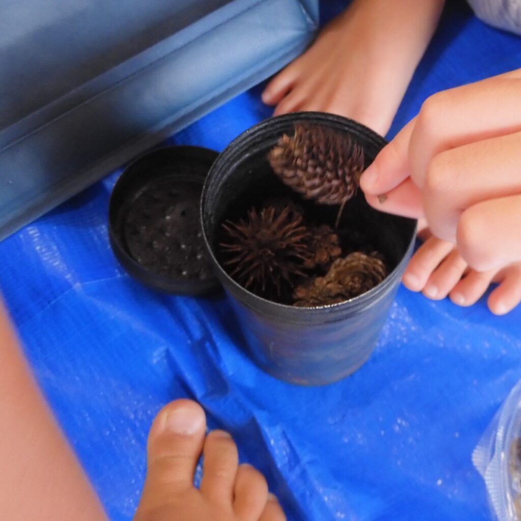マツボックリやドングリなどいろんな木の実がそのままの形で炭に!?各自好きな木の実を選んで缶に入れ、火にくべれば出来上がり♪出来上がった炭はパックに入れて飾りつけました。