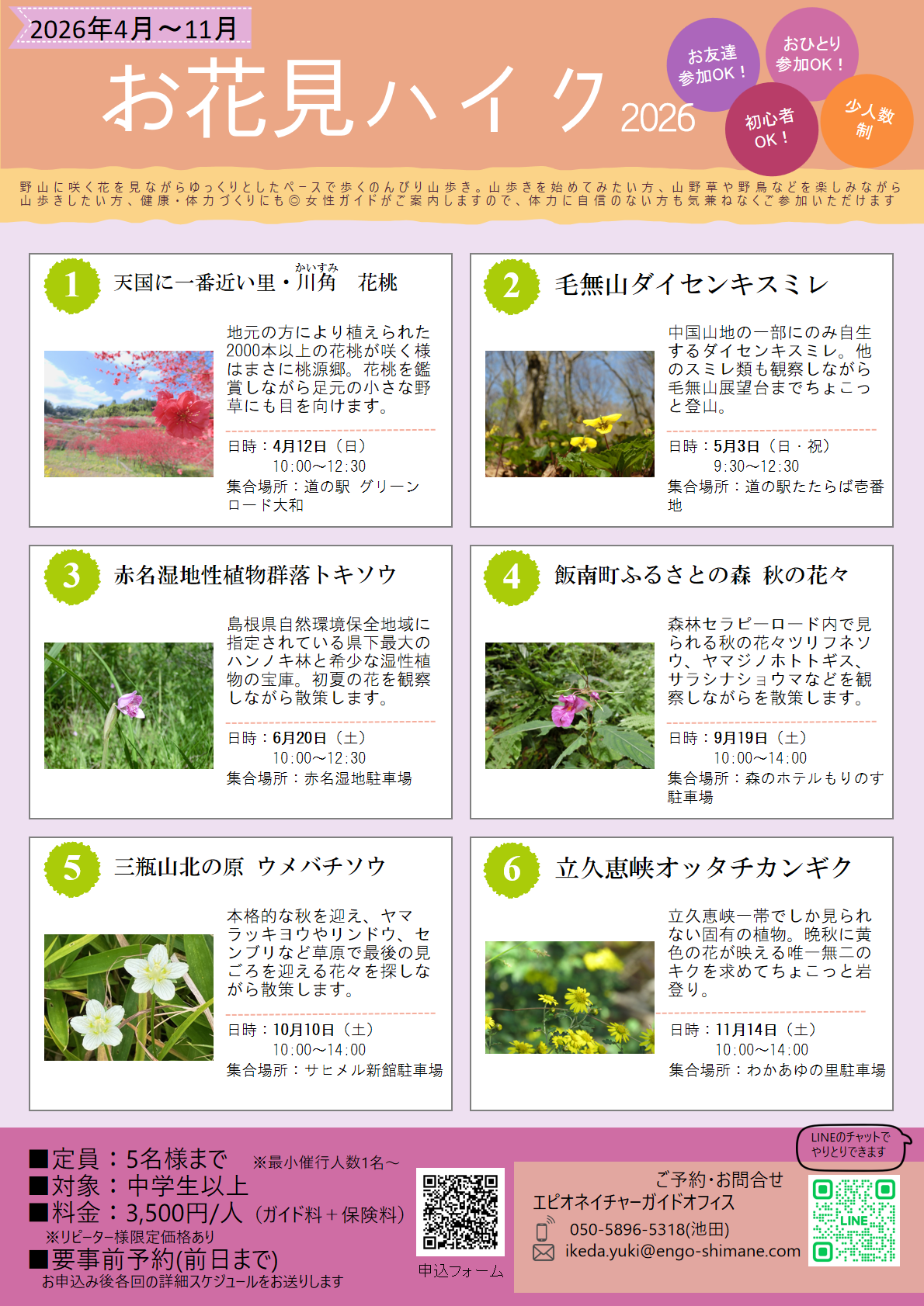 | 日程・時間 | 第1回 4月12日(日)「天国に一番近い里・川角 花桃」10:00~12:30 第2回 5月3日(日・祝)「毛無山ダイセンキスミレ」9:30~12:30 第3回 6月20日(土)「赤名湿地性植物群落トキソウ」10:00~12:30 第4回 9月19日(土)「飯南町ふるさとの森 秋の花々」10:00~14:00 第5回 10月10日(土)「三瓶山北の原 ウメバチソウ」10:00~14:00 第6回 11月14日(土)「立久恵峡オッタチカンギク」10:00~14:00 |